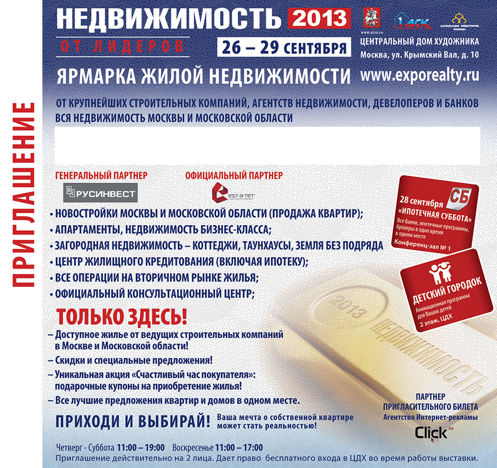 Бесплатный пригласительный билет можно получить на сайте выставки, пройдя предварительную регистрацию http://exporealty.ru/visit/registration/.