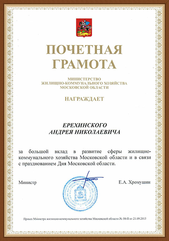 Почетная грамота выдана на основании приказа Министра жилищно-коммунального хозяйства Московской области Е.А. Хромушина от 21 сентября 2015.