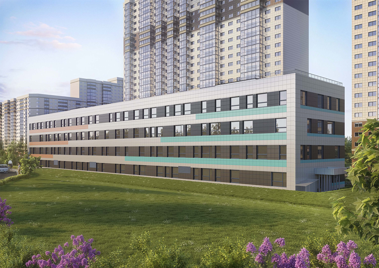 Медицинский центр с поликлиникой для взрослых и детей рассчитан на 413 посещений в смену. Пятиэтажное здание общей площадью чуть более 6 тыс. кв. м входит в четвертую очередь строительства микрорайона. Ввод центра в эксплуатацию запланирован на IV квартал 2019 года.