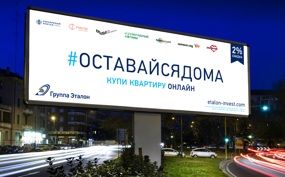 Лаконичные имиджи Группы «Эталон» с актуальным сегодня для всего мира хэштегом #оставайсядома появились на уличных билбордах и в официальных сообществах компании в соцсетях. Девелопер проявил солидарность с компаниями, которые также размещают на своих рекламных носителях призывы оставаться дома, совершать покупки онлайн, заботиться о своем здоровье и соблюдать правила гигиены.