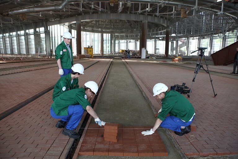 Облачившись в фирменные куртки и надев каски, стройотряд в сопровождении специалистов ЛенСпецСМУ отправился в павильон корпуса «Н» музея ОЖД, где и приступил к работе.