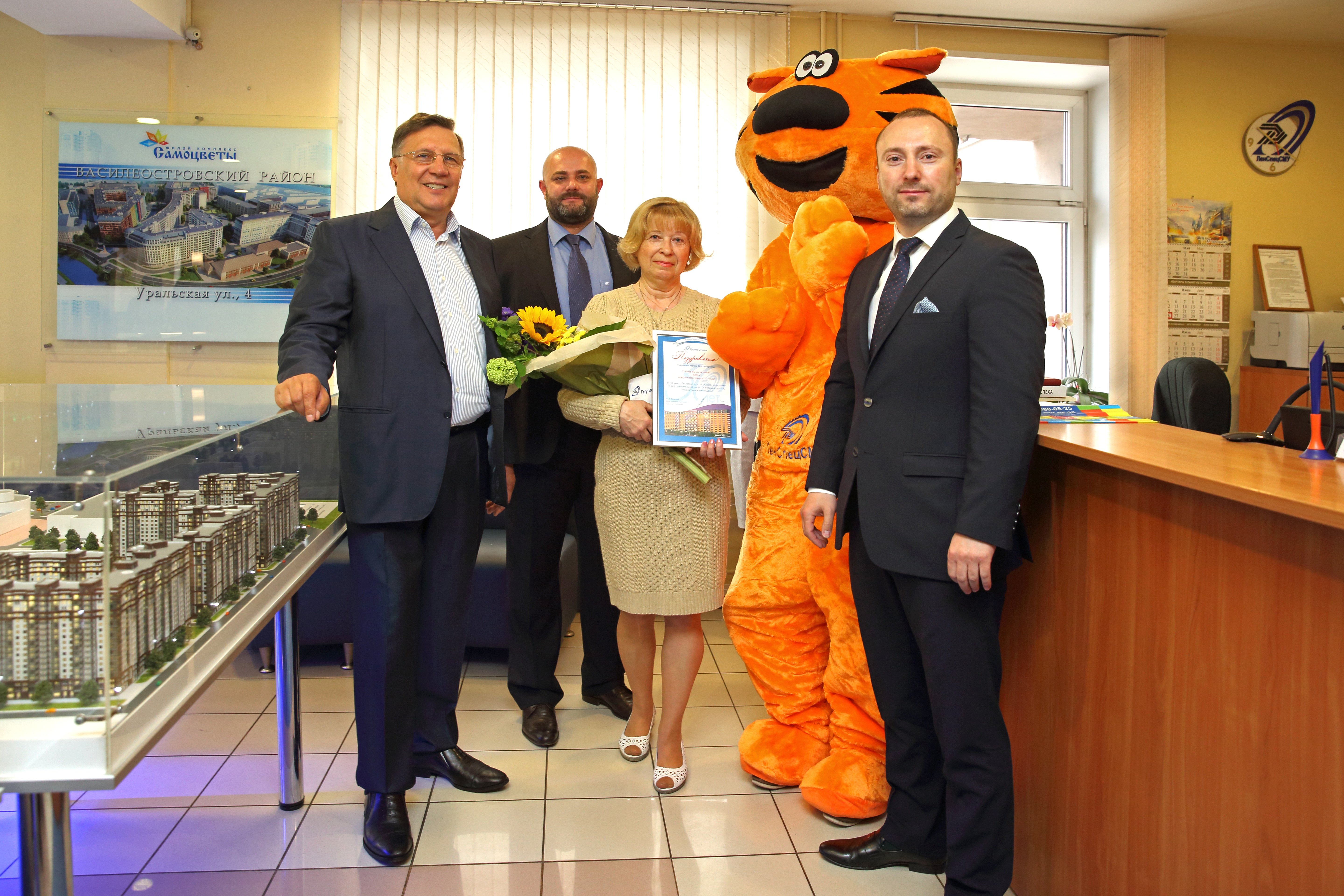 4000-го покупателя поздравили Генеральный директор Группы «Эталон» Вячеслав Заренков, директор по продажам Группы «Эталон» Андрей Останин и технический директор компании «Эталон ЛенСпецСМУ» Юрий Бородин. «Сегодня мы поздравляем нашего почетного 4000-го покупателя. Мы рады, что второй квартал 2017 года мы завершаем на такой ноте, с хорошими результатами. Мы очень ценим доверие наших клиентов, которое они оказывают нам на протяжении многих лет. От всего сердца желаю Вам в новом доме благополучия, тепла и уюта!» - сказал Вячеслав Заренков, поздравляя «юбилейную» покупательницу. Ирине Владимировне вручили традиционные памятные подарки: почетный диплом, кофемашину, книги основателя Компании Вячеслава Заренкова и символ Компании - Рыжего Кота.