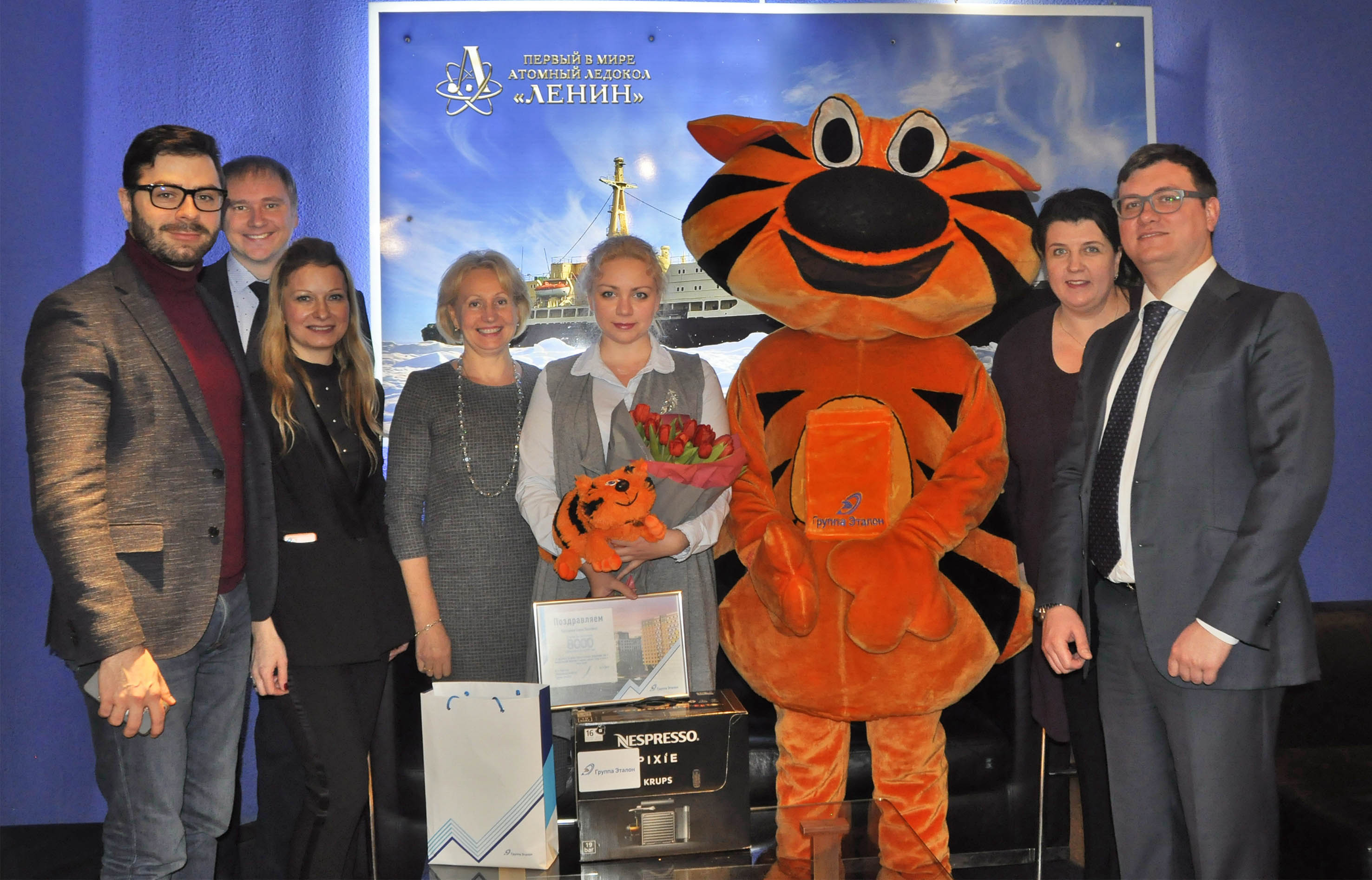 По традиции Елене Павловне вручили памятные подарки: почетный диплом, кофемашину, книги основателя Группы «Эталон» Вячеслава Заренкова и символ Компании – Рыжего Кота.