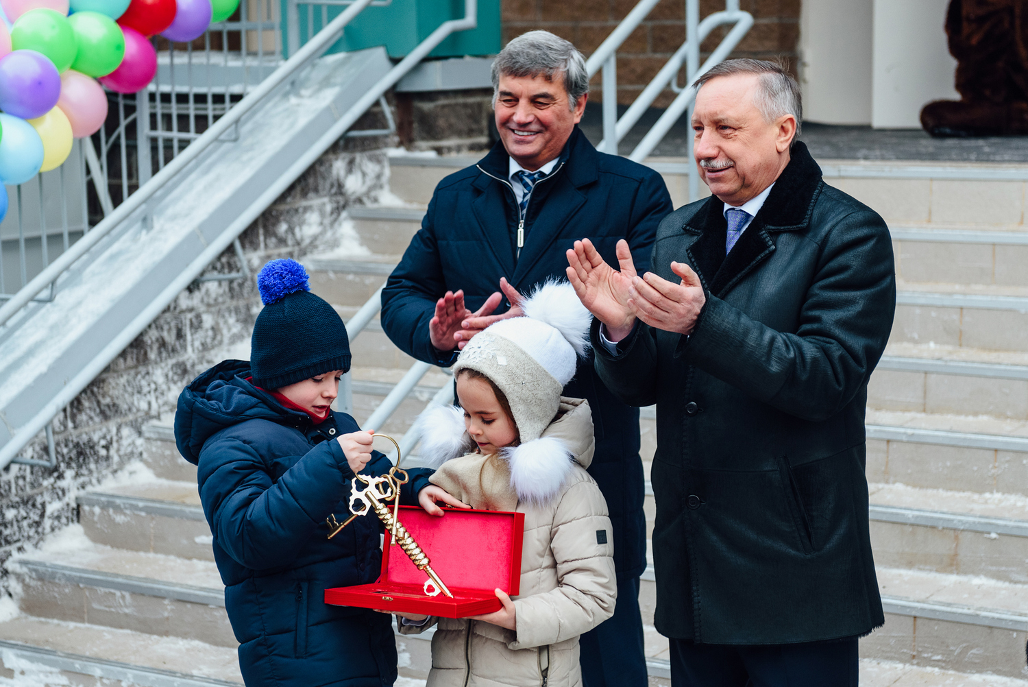 После выступления врио губернатора Санкт-Петербурга Геннадий Щербина от лица строителей передал символическую связку ключей от детского сада Александру Беглову, который вручил ее детям – воспитанникам нового детского сада.