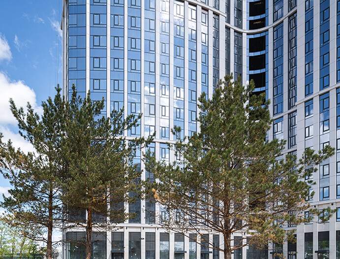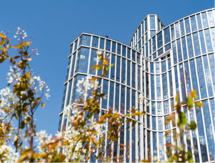 Три изящные башни-трилистника, стирают границы с окружающим миром, создают эффект невесомости, парения и невероятного единения с природой. В больших окнах отражается небо и городской ландшафт, комплекс становится активным участником среды, формируя новые образы современного мегаполиса.